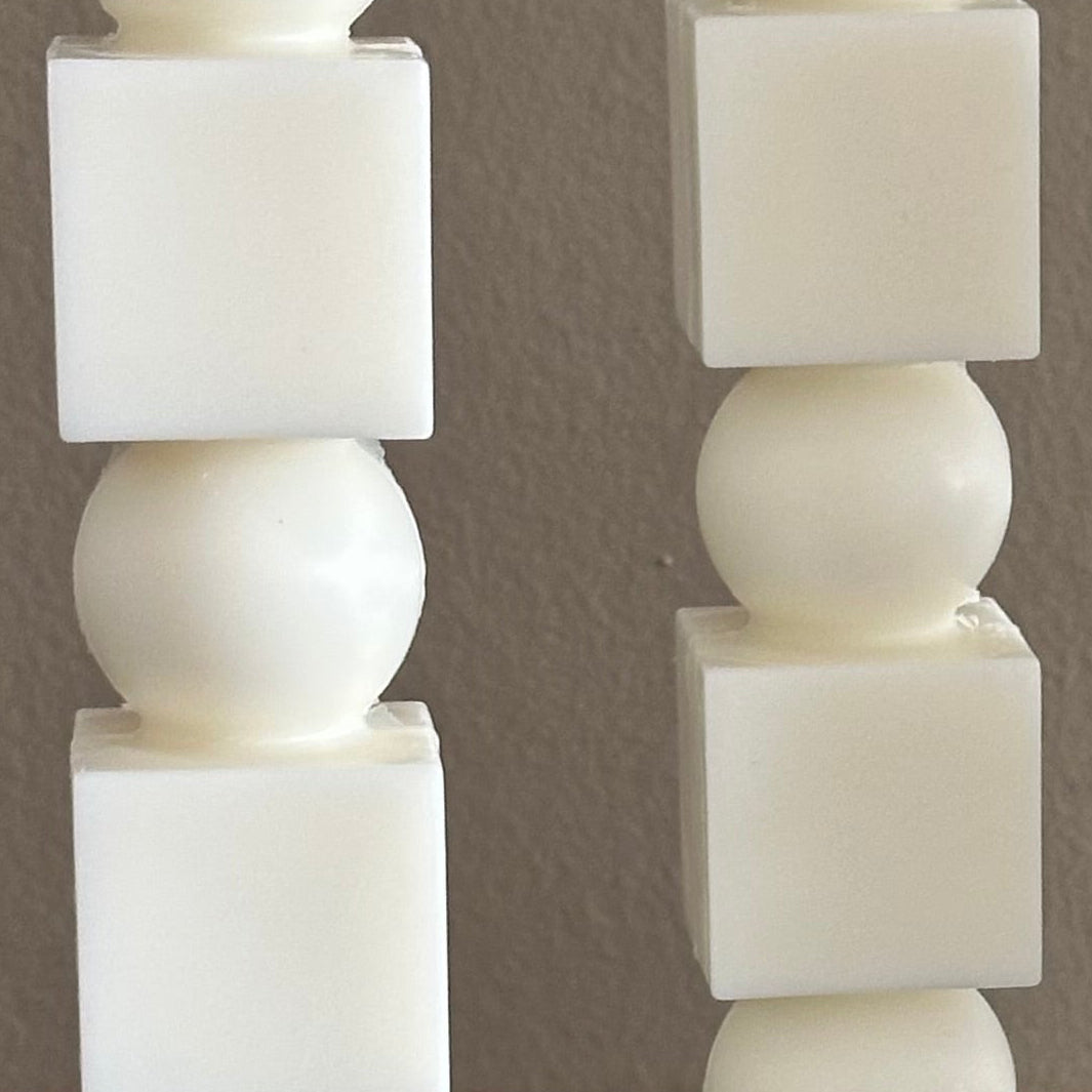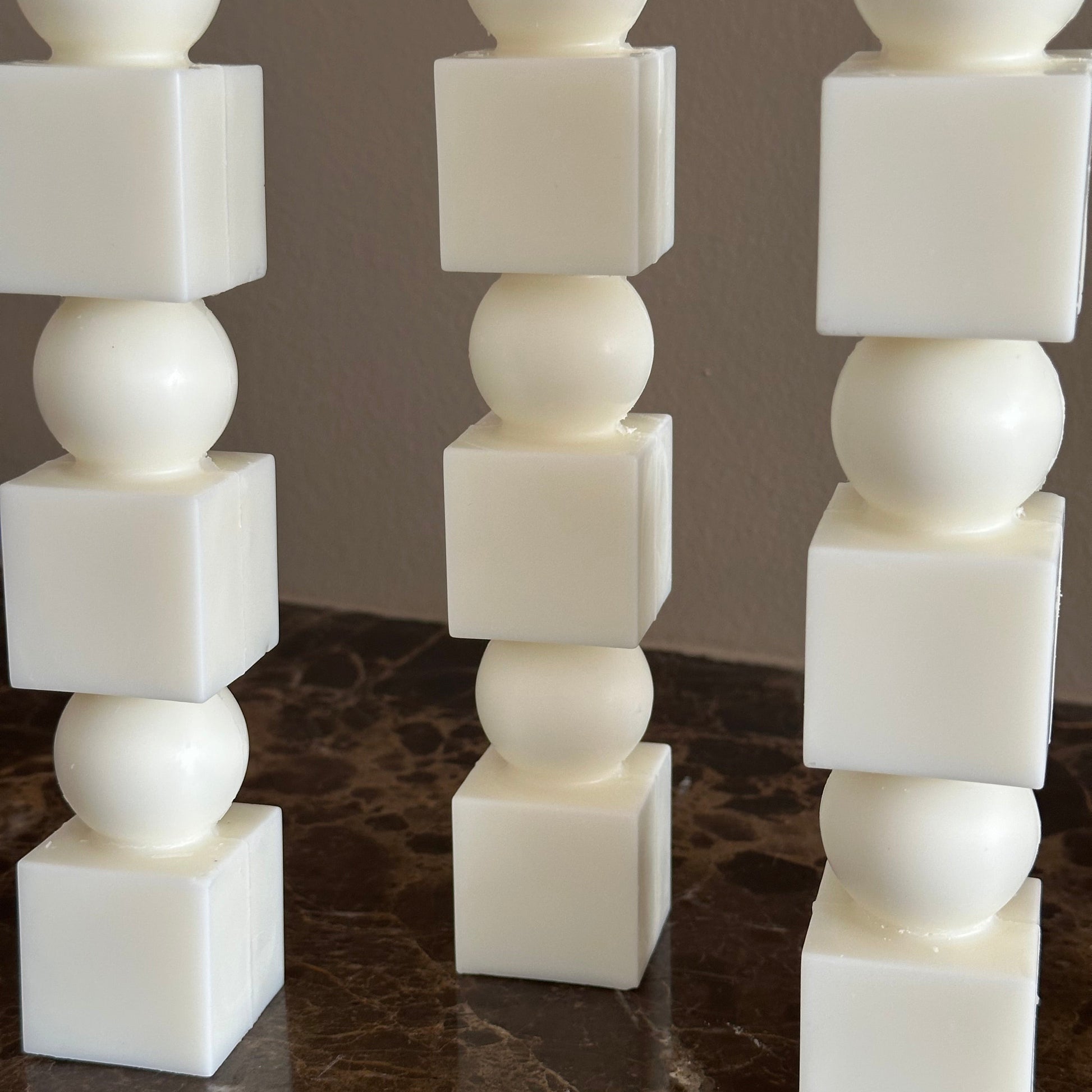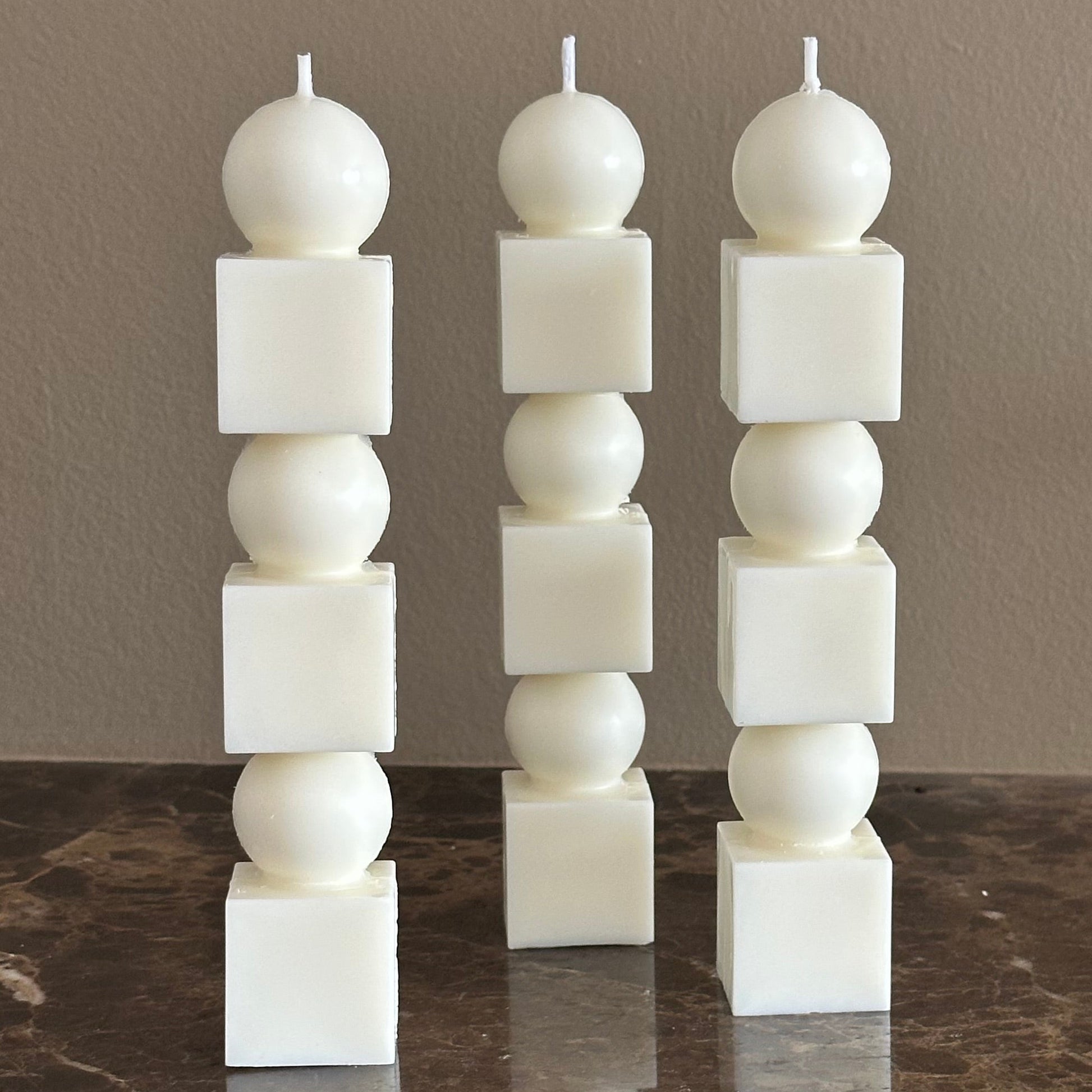 Vela com bolas e quadrados feita em cera EcoMix e pavio de algodão.